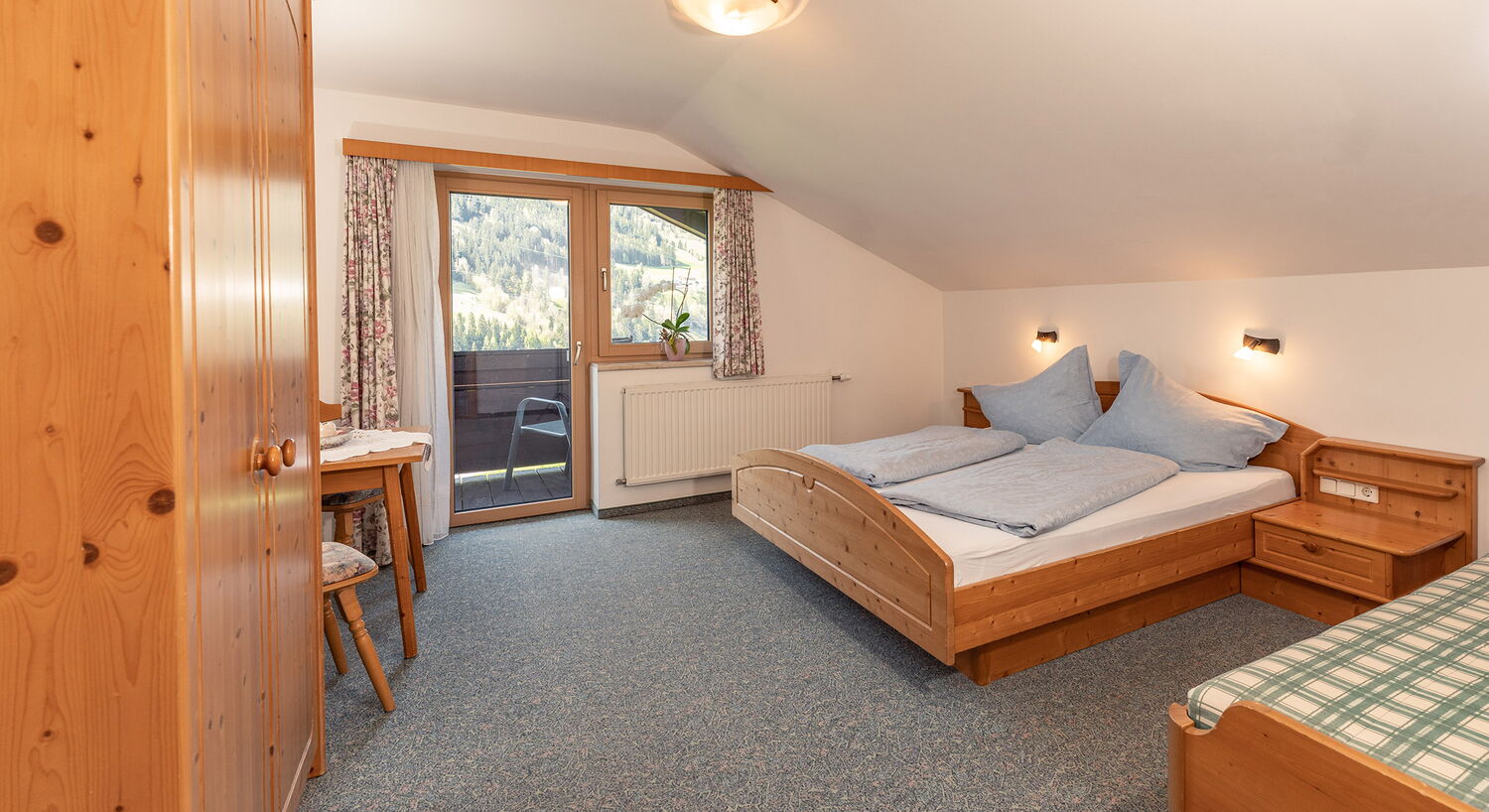 Two separate bedrooms, each with a double bed and a sofa bed, ensure a comfortable stay. We have chosen an appealing alpine style for the furnishings, which spoils our guests with cosiness and plenty of storage space for their luggage. We are also happy to provide you with a cot - please contact us in advance.